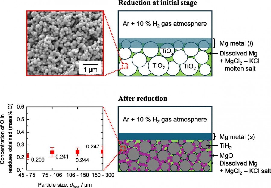 In recent years, reduction followed by deoxidation using magnesium (Mg) in a hydrogen gas (H₂) atmosphere has been suggested as a method to produce titanium (Ti) metal with a low oxygen (O) concentration from titanium dioxide (TiO₂). In this study, a single-step magnesiothermic reduction of TiO₂ in an H₂ mixed gas atmosphere was developed to produce Ti with a low O concentration. In the experiments, the reduction of sintered/unsintered TiO₂ with particle size below 300 μm in molten magnesium chloride (MgCl₂) – potassium chloride (KCl) was conducted at 973 K for 12–48 h in an argon (Ar) – 10 % H₂ gas atmosphere. The influences of microstructure and particle size of TiO₂, the ratio of salt to TiO₂ feed, and reduction time on the O concentration and phases of the obtained residues were investigated. Under certain conditions, TiH₂ powder with 0.209 mass%O was directly produced from TiO₂ powder consisting of micron-scale secondary structures (45–75 μm) formed by the agglomeration of nanosized primary particles. The results of this study demonstrate the feasibility of the suggested single-step magnesiothermic reduction of TiO₂ in high hydrogen chemical potential to produce Ti with a low O concentration.